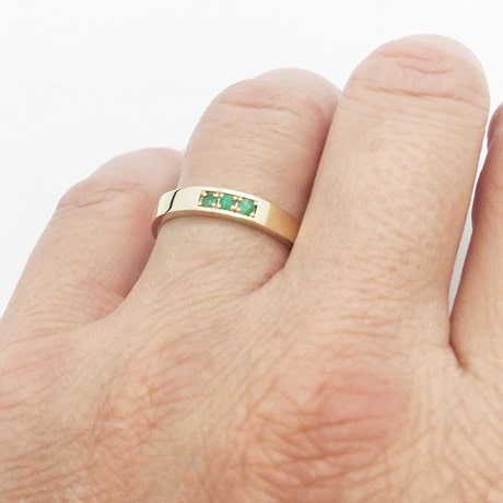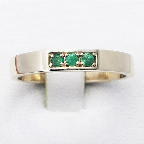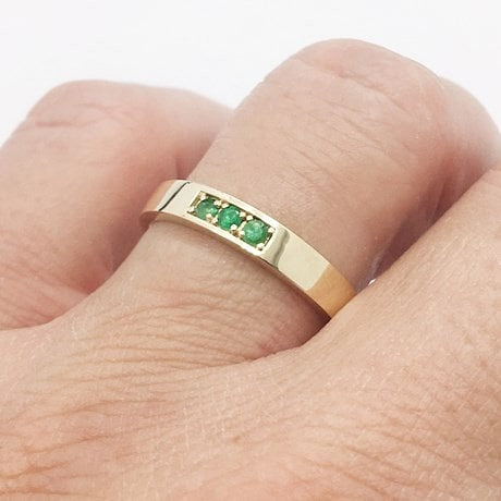 Pour les couples recherchant des bagues appairées, ce duo d'alliances avec pierres émeraude sera une option intéressante. L'alliance pour homme est un simple anneau plat de type bandeau présentant trois petites pierres d'émeraude rondes sertis par 4 griffes. Ce design offre de la discrétion ainsi qu'une touche de couleur qui séduira les hommes désireux de porter une alliance originale ornée d'émeraudes.