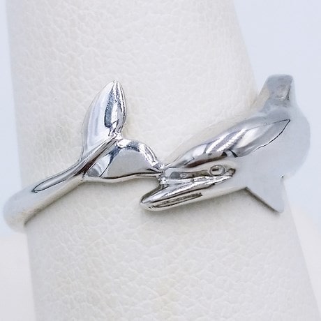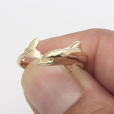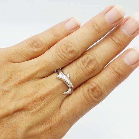 Cette bague reprend la forme d'un dauphin enroulé autour du doigt. Pour des raisons évidentes de confort, seul la moitié du corps est représenté moulé en relief afin de laisser la partie intérieure de l'anneau lisse sur le doigt.