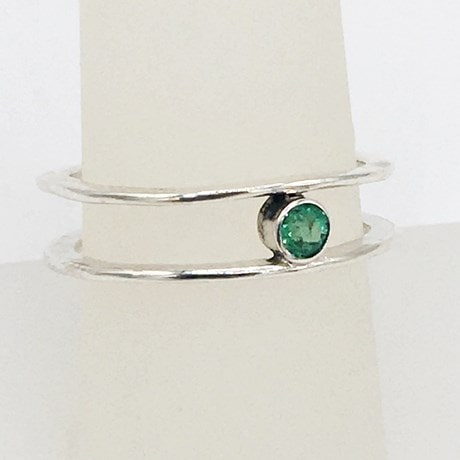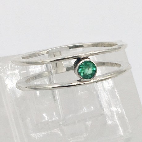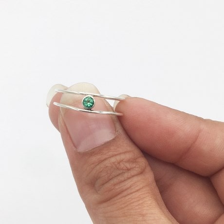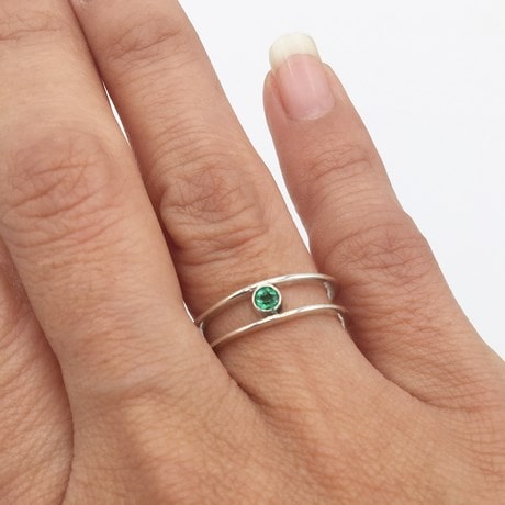 Cette bague se compose de deux anneaux fins entourant une petite pierre d'émeraude naturelle ronde de 2,5 millimètres de diamètre. Celle-ci est sertie clos et dépasse tout juste du bord des deux anneaux l'entourant.