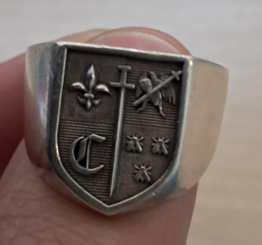 Confection sur-mesure d'un duo de chevalières en platine 950 avec plateau en forme d'écu et gravure du blason visible en images.