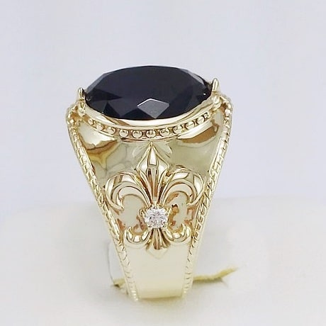 Deux fleurs de lys moulées viennent décorer les montants de la chevalière. Leur taille assez grande les rendent bien visible une fois la bague portée au doigt. Le centre de ces fleurs de lys est agrémenté chacun d'un petit diamant serti de 5 griffes, assurant une bonne tenue des pierres.