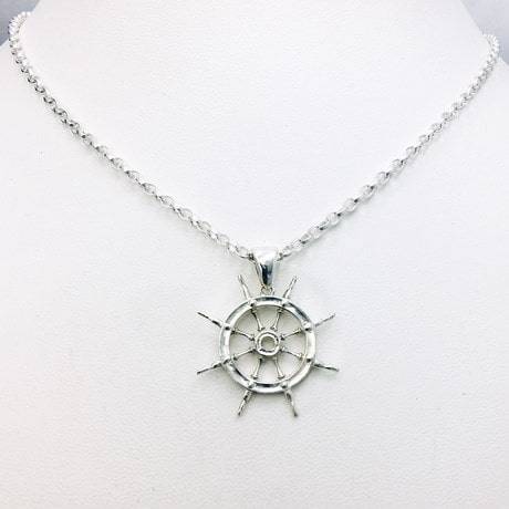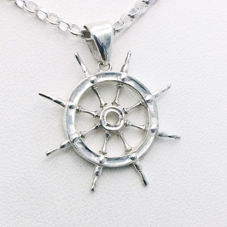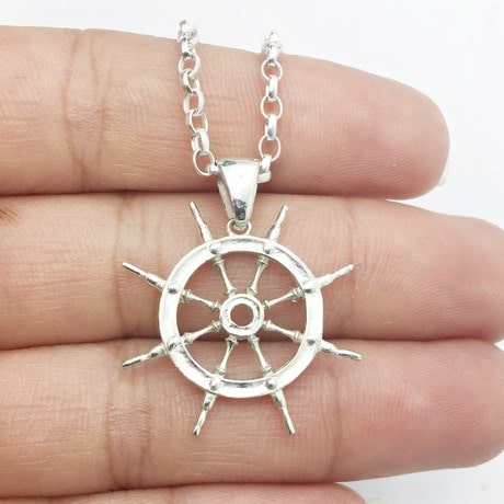Avec ce design, nous avons voulu présenté un pendentif sobre, mais bien reconnaissable de ce type de gouvernail à roue, sachant que la forme circulaire se prête bien à une multitude de personnalisations possibles avec des pierres serties sur le pourtour de la roue ou bien en placant une ancre de marine au centre de la roue.