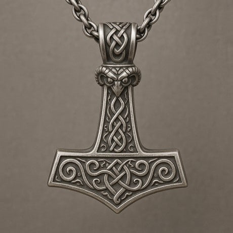 Sur la tête du marteau (partie horizontale), des spirales enroulées s’opposent symétriquement, encadrant un nœud entrelacé central. Ces motifs sont directement inspirés de l’art viking dit "Urnes" (fin XIe siècle), connu pour ses lignes fluides, torsades, et courbes élancées représentant la force, la protection et l’interconnexion du monde.