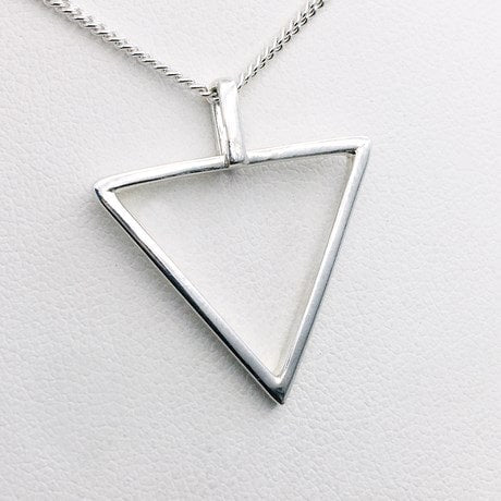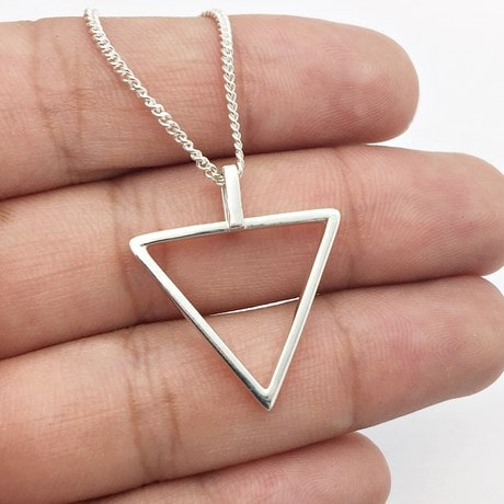Pendentif au style épuré et moderne pour femme en forme de triangle. Le triangle est formé par un fil de métal précieux (or ou argent) de section rectangulaire avec une bélière discrète qui donne un style unique au pendentif.