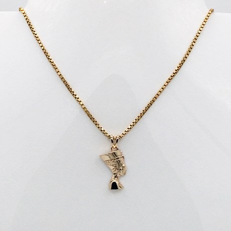 - 20 millimètres: La tête de Néfertiti fait 20 millimètres de haut par 14 millimètres de large et le pendentif mesure 26 millimètres de hauteur avec le passant de chaîne pour un poids d'or 18 carats (en version or) de 2,8 grammes